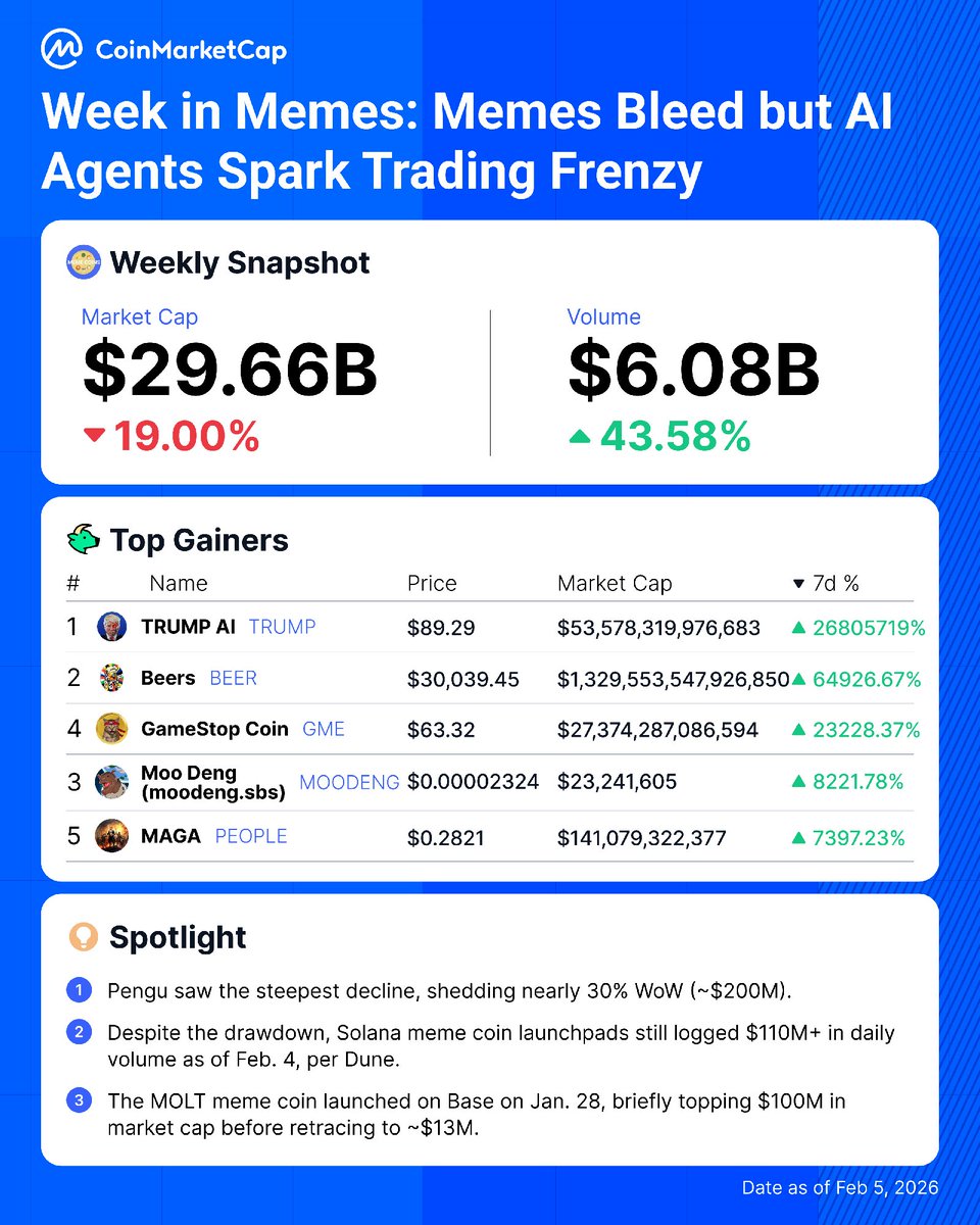 模因周:模因流血但人工智能代理引发交易狂潮 大盘模因在残酷的溃败中流血,但新的人工智能元让战壕保持活力。 下面的内勺。 🧵 1/7