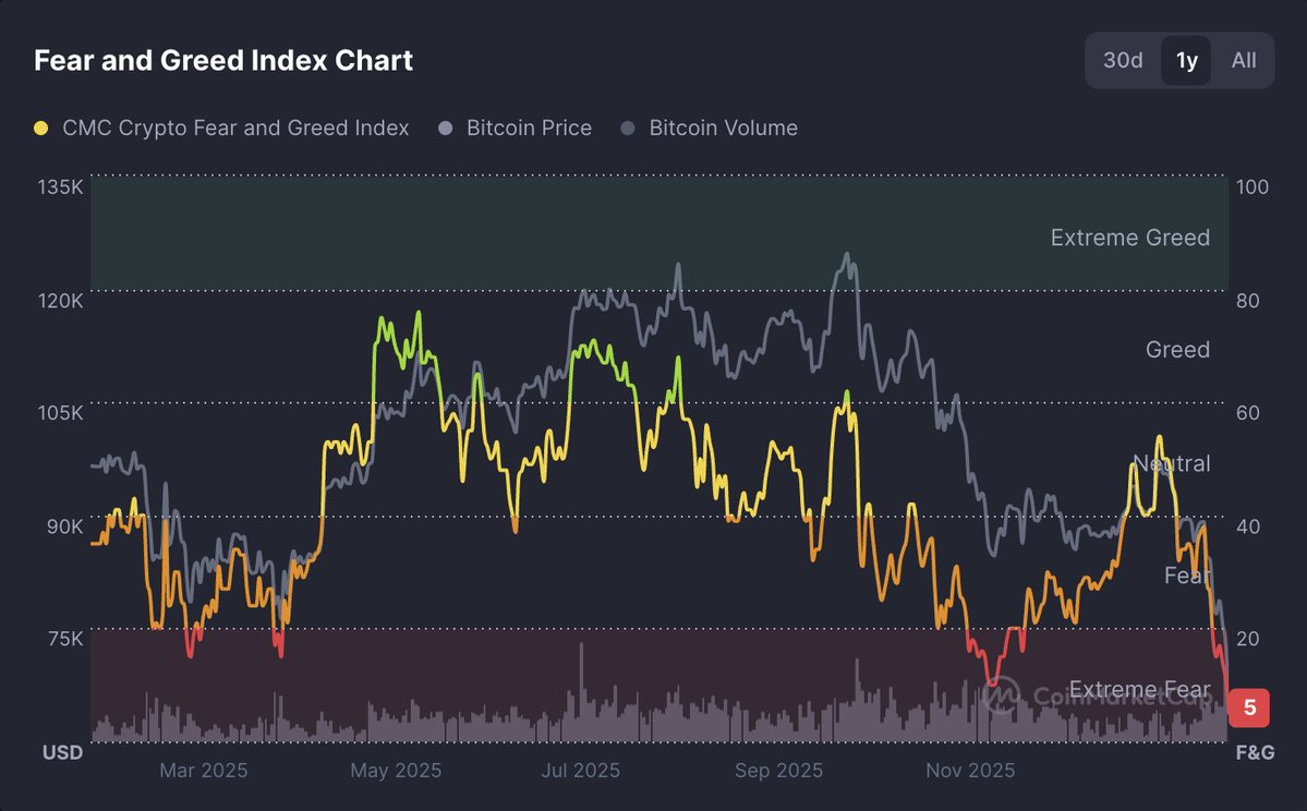 Crypto Fear and Greed Index hits 5, matching FTX-era lows as "extreme fear" grips market after $BTC briefly dropped near $60K. https://t.co/KJfLOLrzBe