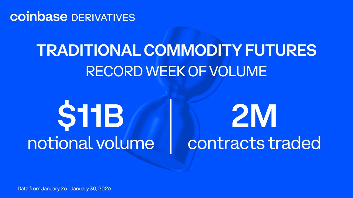 Coinbase 衍生品上传统商品创历史新高的一周。 1 月份最后一周名义交易量约为 11B 美元,合约交易量为 200 万份。 查看我们最新的商品期货⬇️ 铜: 白金: