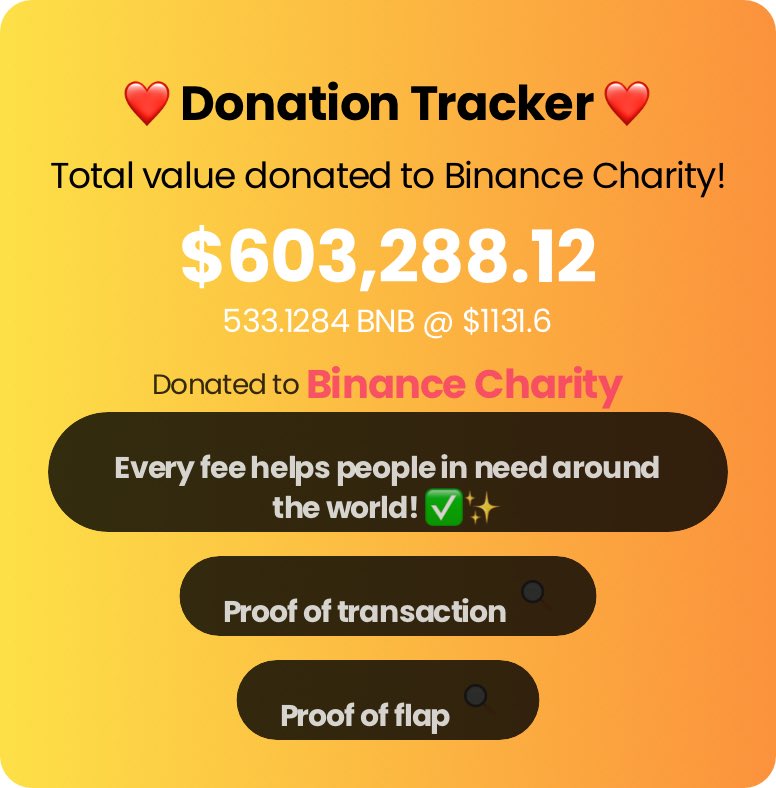 Flap #MEMEFORGOOD 上的税收代币捐款已为 @BinanceBCF @GiggleAcademy 和其他有需要的人筹集了超过 600 个 BNB。 ❤️