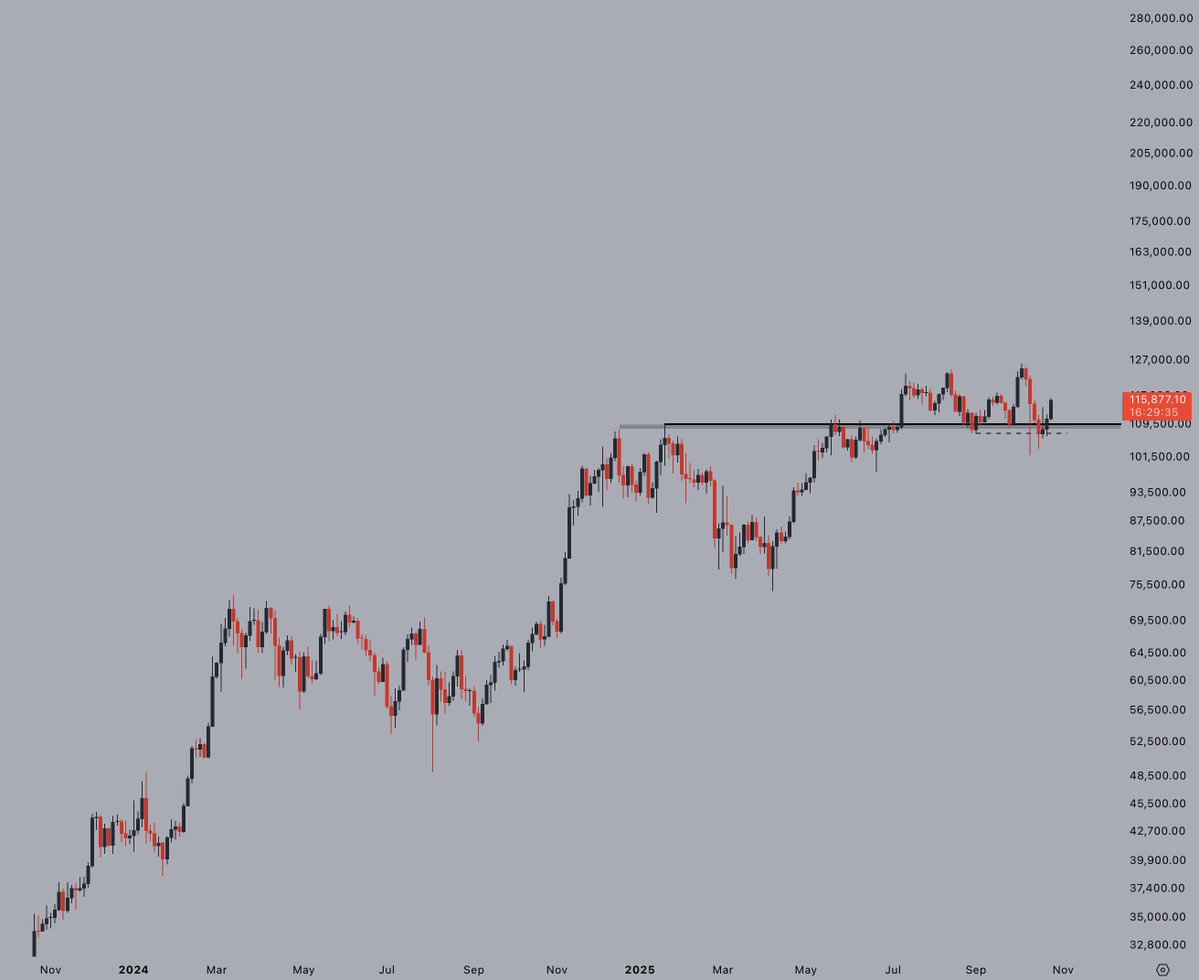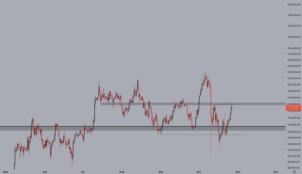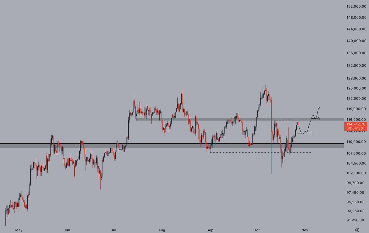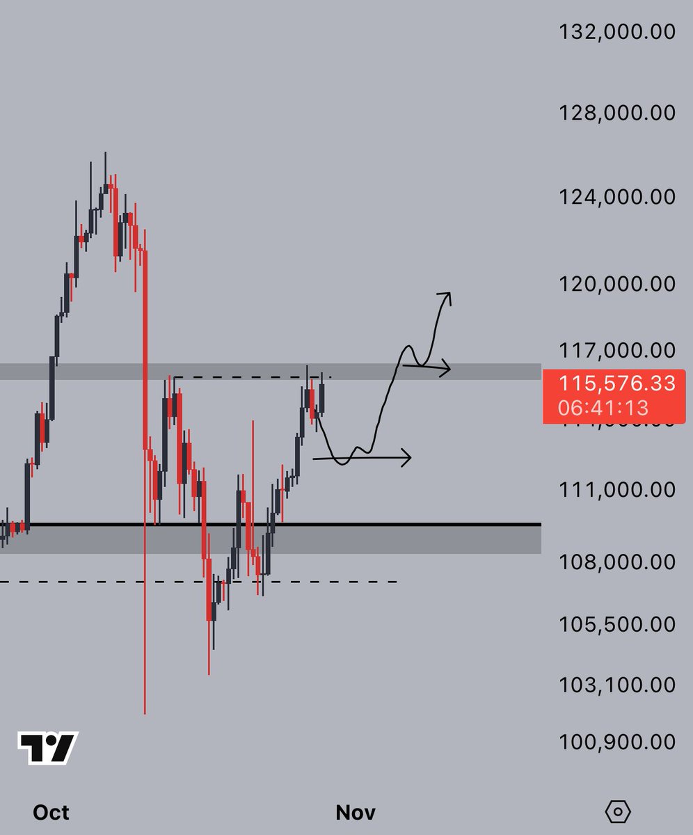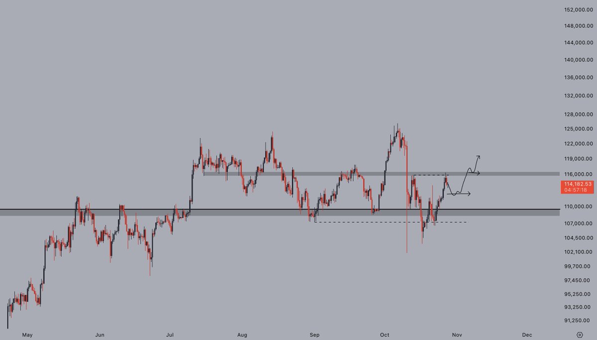 #Bitcoin is still in the same range. Held the range lows, formed higher lows, and now a local higher high too. Slamming straight into $115-117k resistance area. Flip it back into support, and bulls are back in business. Fingers crossed! https://t.co/XBcGSFTd9C