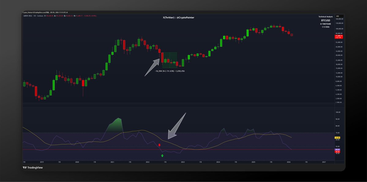 先来看下月线的RSI,目前BTC月线RSI确实已经处于相对低位了,类比上轮熊市的话,当前RSI处于20225月1日~6月30日之间的阶段。