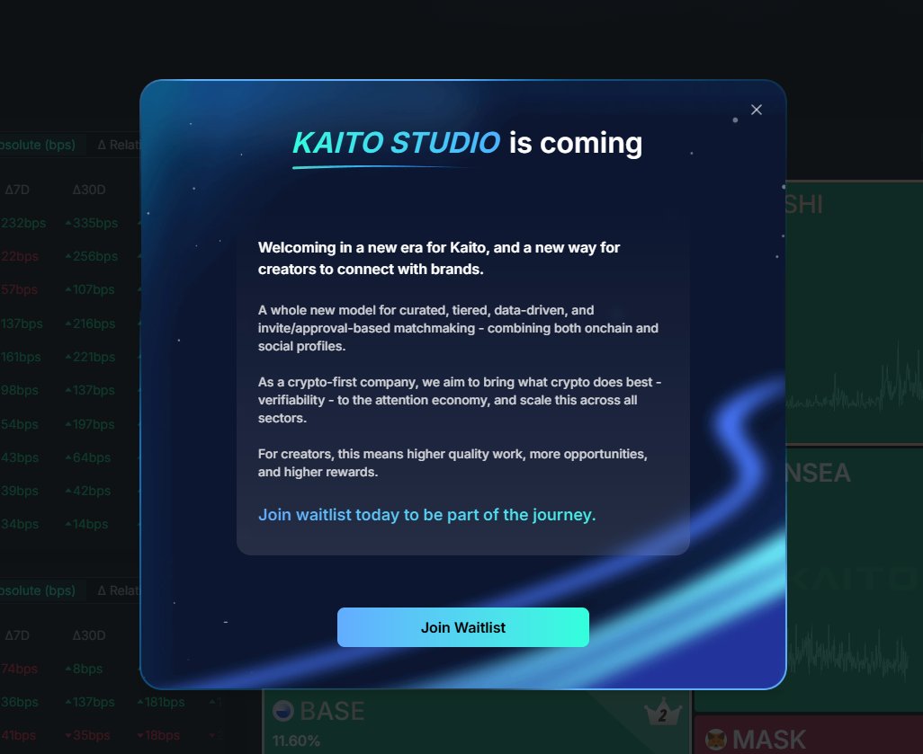关于这个 Studio,我猜测应该是一个数据主导的个人IP变现平台,Kaito 要做的事情很简单,吸纳足够多的注意力,将其 转化为议价能力。