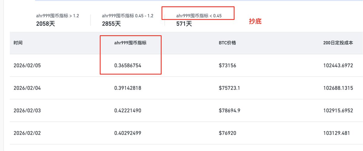 Ahr比特币定投指数已低于0.45,处于抄底区间!