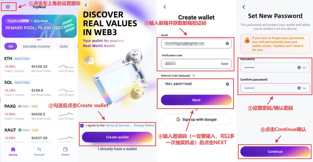 进 App 后点左上角设置 → “Create wallet” → 输入邮箱验证码。