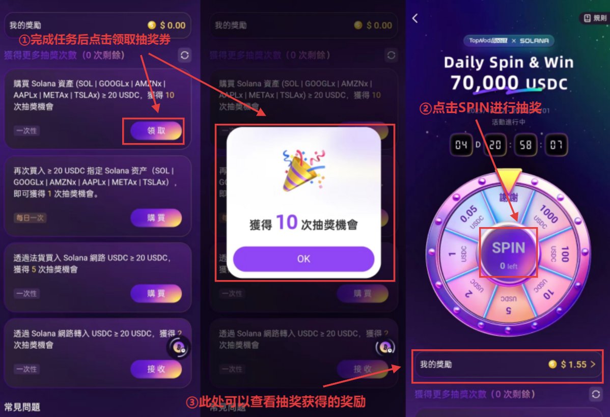 Solana:单笔买 $20(USDC→SOL / APPLx),10 张奖券