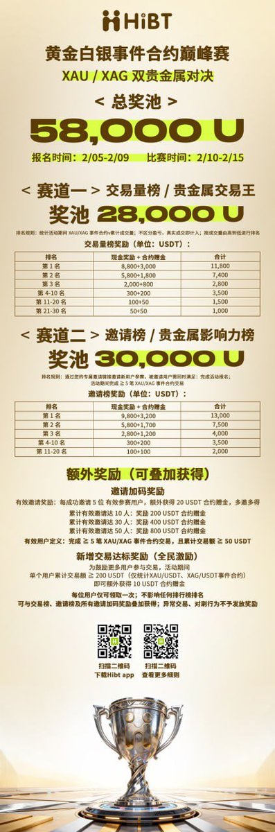 @HIBTGlobal 搞的这个“黄金白银巅峰赛”,总池子58,000U。我仔细看了,它的核心设计其实提供了一种对冲市场无聊风险的Alpha: