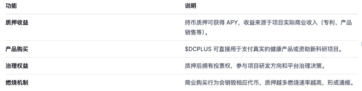 目前官方平台首个亮相的去中心化健康科技项目是 @dcplus_official 将科研成果转化为可验证、可流通的代币化资产。