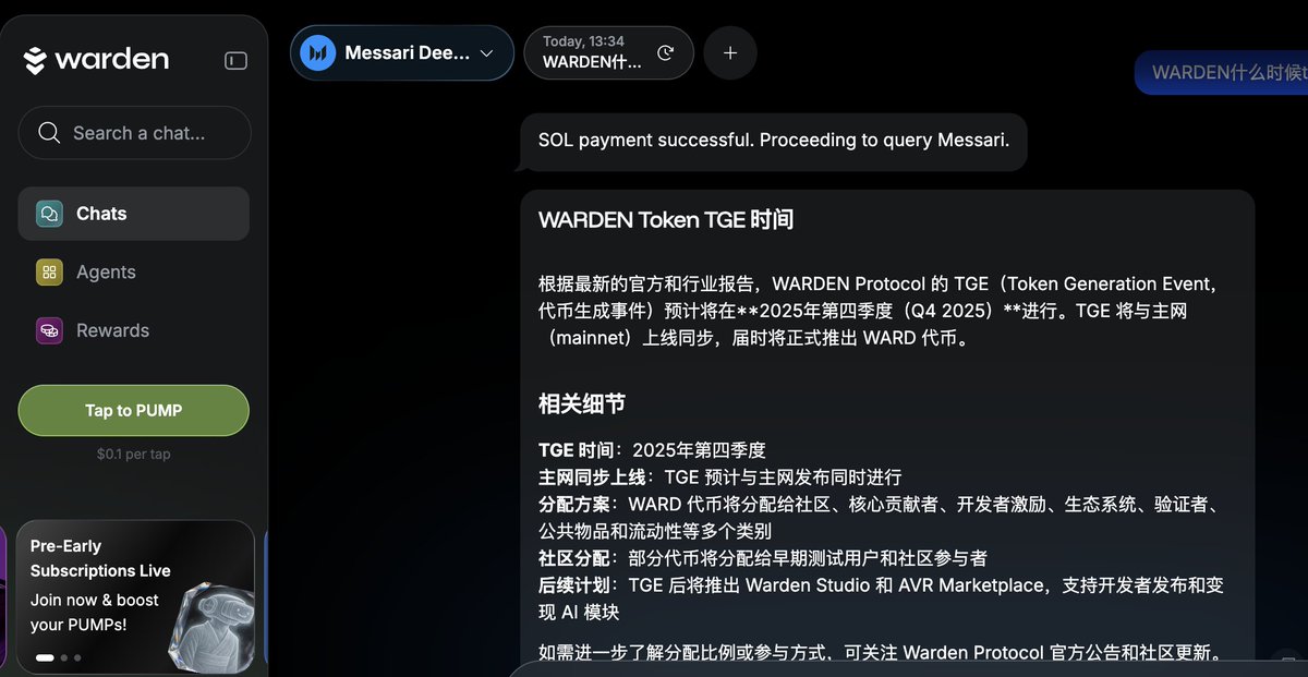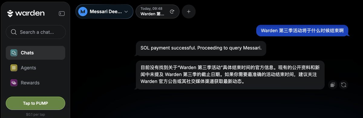 然后,Messari Deep Research 给的回答是 “目前没有找到关于“Warden 第三季活动”具体结束时间的官方信息。现有的公开资料和新闻中未提及 Warden 第三季的截止日期。如果你需要最准确的活动结束时间,建议关注 Warden 官方公告或其社交媒体渠道获取最新动态。”