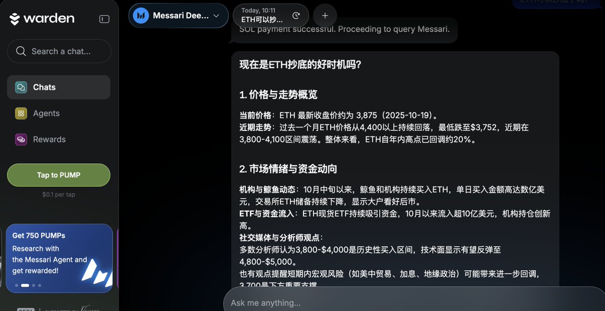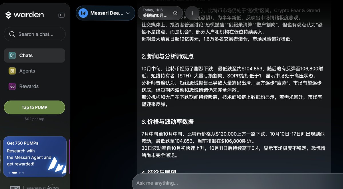 问题:“ $BTC 现在可以抄底了吗” 然后Messari Deep Research 给了我回复。 @wardenprotocol