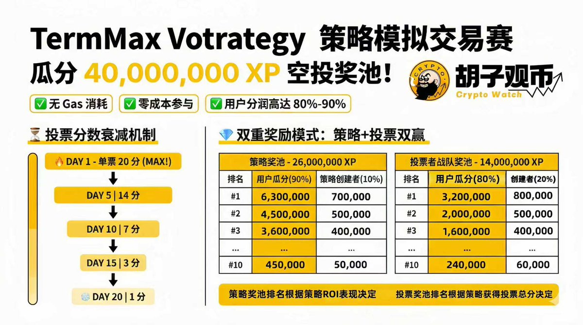 昨天上线的 @TermMaxFi 策略模拟交易赛,零GAS消耗,每天点两下投票,空投奖励还是比较丰厚的,可以多多参与投票我的策略💪。