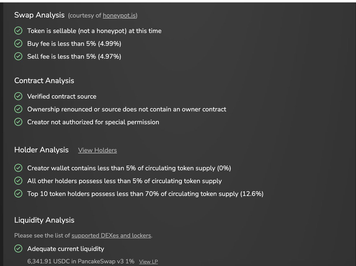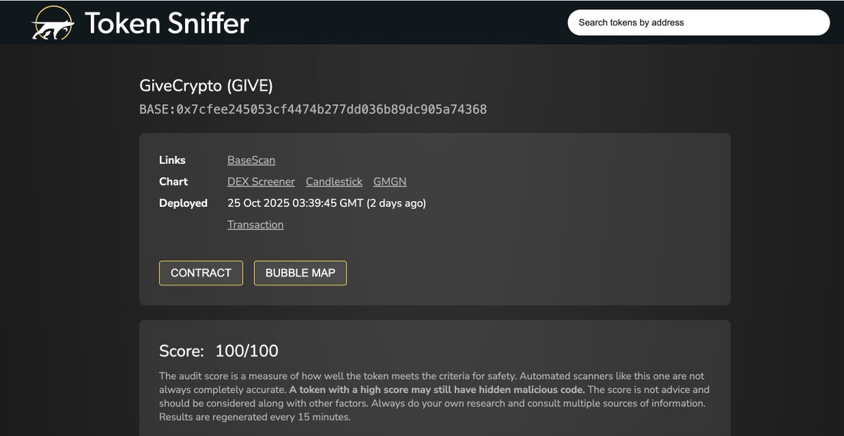 Token Sniff, one of the most authoritative contract checking websites, shows that the $GIVE token score is 100 points, ownership renounced, and LP has been locked for 1 year.