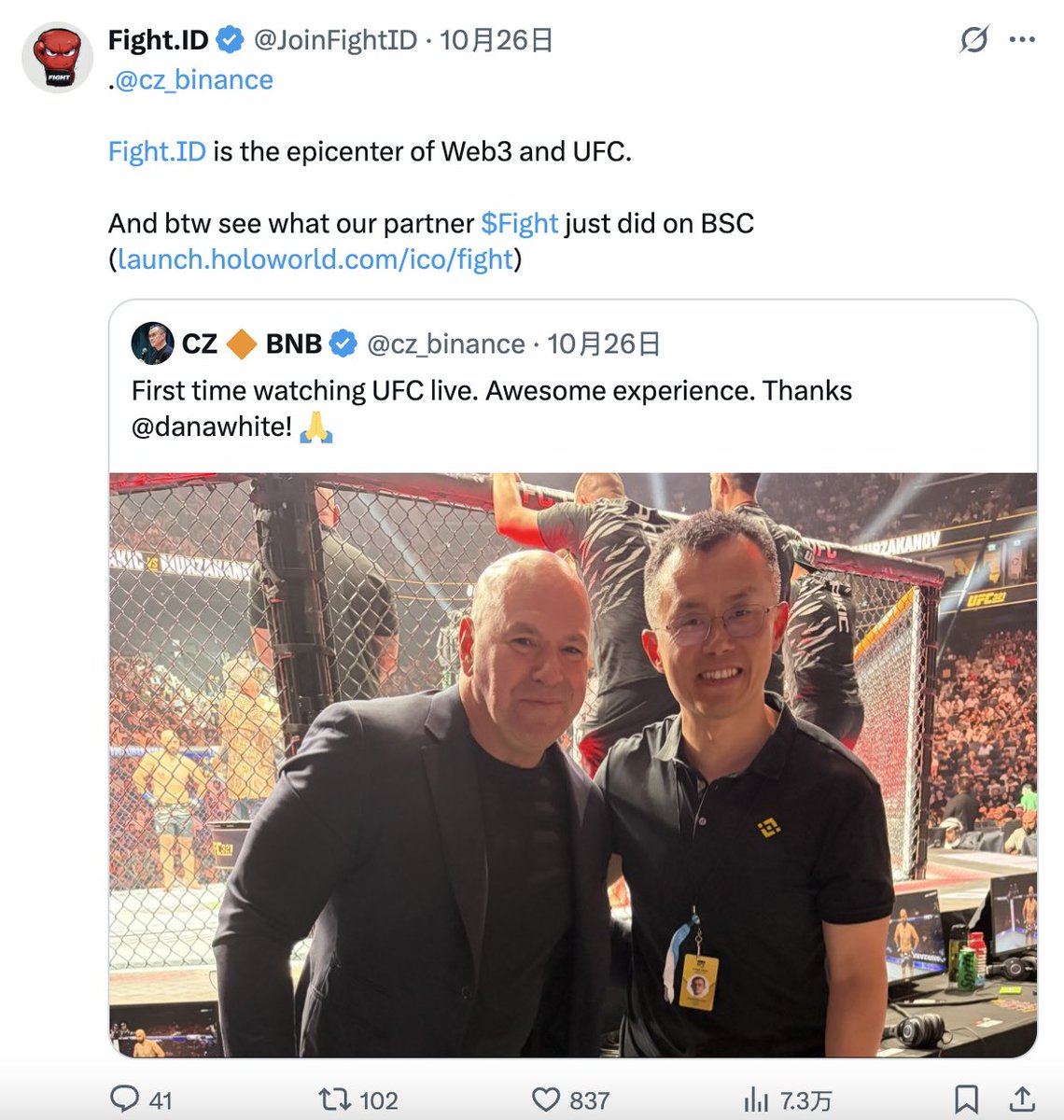 这次打新是跟 @JoinFightID 合作,https://t.co/l73eEpOtTl是官方获得UFC(终极格斗冠军赛)多年授权的Web3平台,专注于MMA/格斗运动粉丝生态。项目具有极高合法性。 $FIGHT 11月TGE,基于UFC全球7亿粉丝基础和独家IP授权优势,还有cz亲自到场助阵,很稳健的理财局。