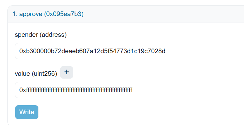 - value (uint256) 写无限金额: 0xffffffffffffffffffffffffffffffffffffffffffffffffffffffffffffffff