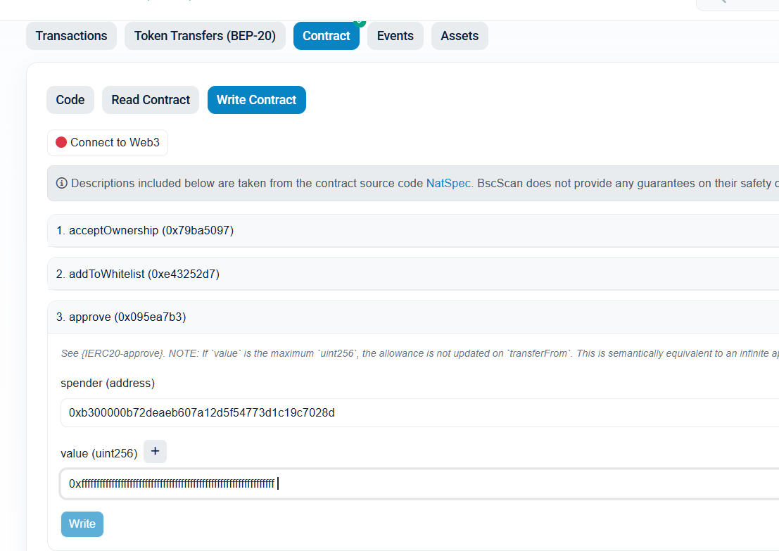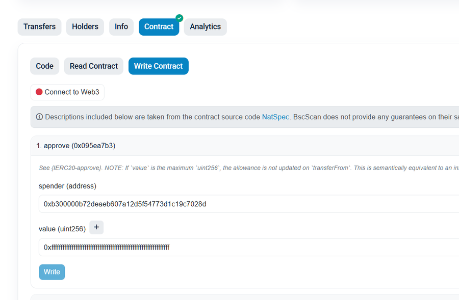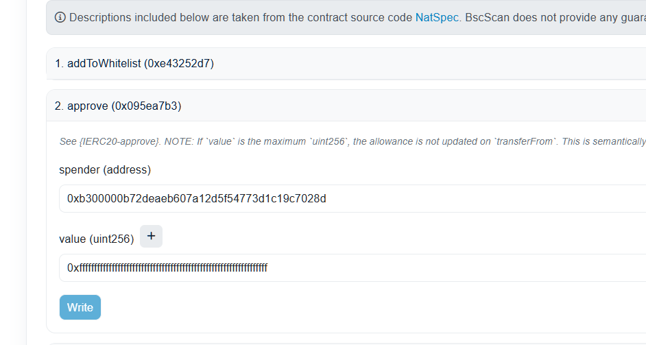 spender (address) 写币安 dex 地址:0xb300000b72deaeb607a12d5f54773d1c19c7028d value (uint256) 写无限金额:0xffffffffffffffffffffffffffffffffffffffffffffffffffffffffffffffff
