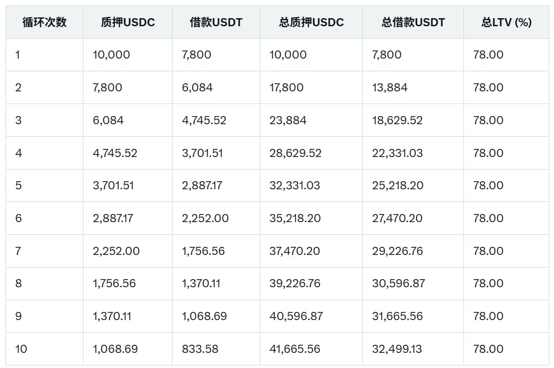 💡假设:初始存款 10,000 USDC,循环贷 10次,LTV 78%,借贷过程如图所示