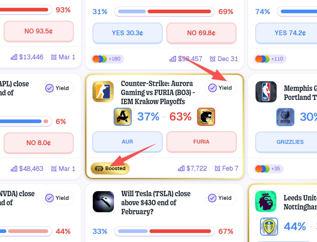 另外就是也可以和前面提到的两个新规则结合起来,去挂单那些带有“Yield”或者“Boosted”标签的市场