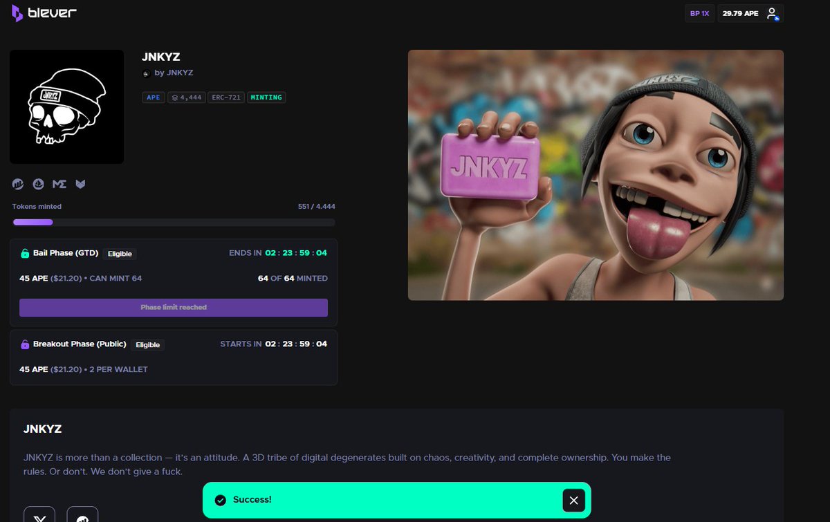 如果您有 JNKYZ 保释通行证,您可以在 GTD 阶段铸造。