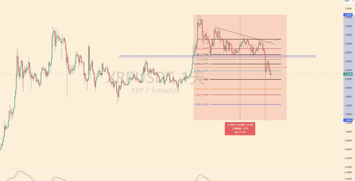 一,认为政府开门受影响比较大的币种应该是一揽子ETF币种,用 $XRP 举例,他的斐波那契压力位与结构压力位都在2.75左右,突破此为止则反转的概率大于反弹。