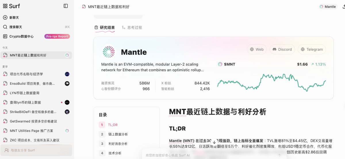 它就帮我拉出了 $MNT 的交易量、生态增长、社交热度曲线,还给了结论。”