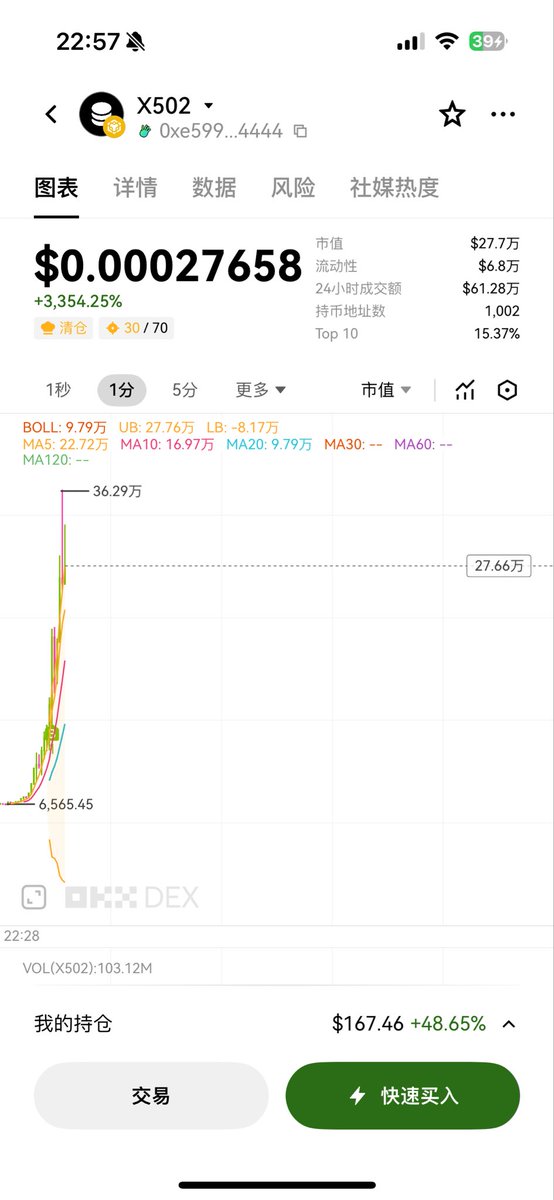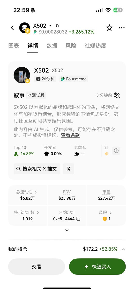 x402meme的龙头!纯靠炒作,高风险高回报,随时可能归零,现在市值54M,喜欢豪赌的朋友可以买一点,资金不多的谨慎入手!