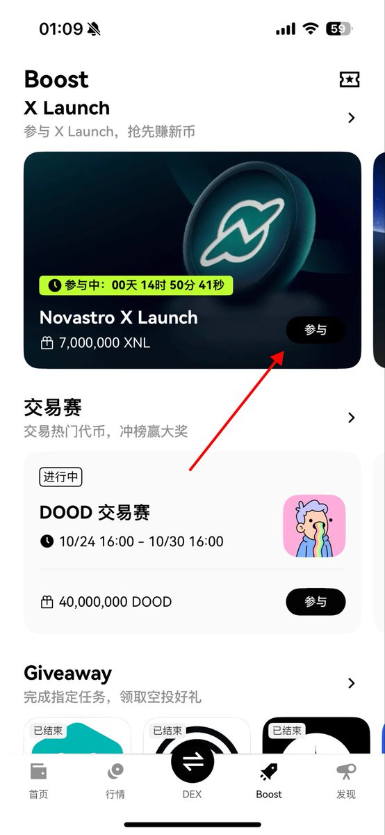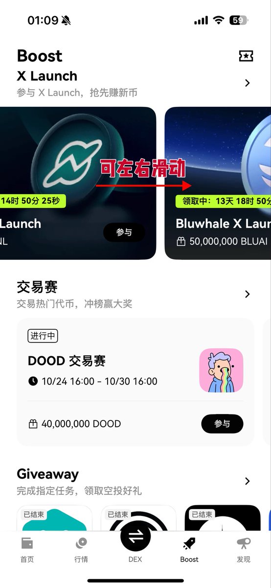 先切换到 #OKX DEX ➡️ 点击 #Boost ➡️点击 #X Launch 的活动页面参与(注:项目比较多,页面可以左右滑动,不要漏领咯)