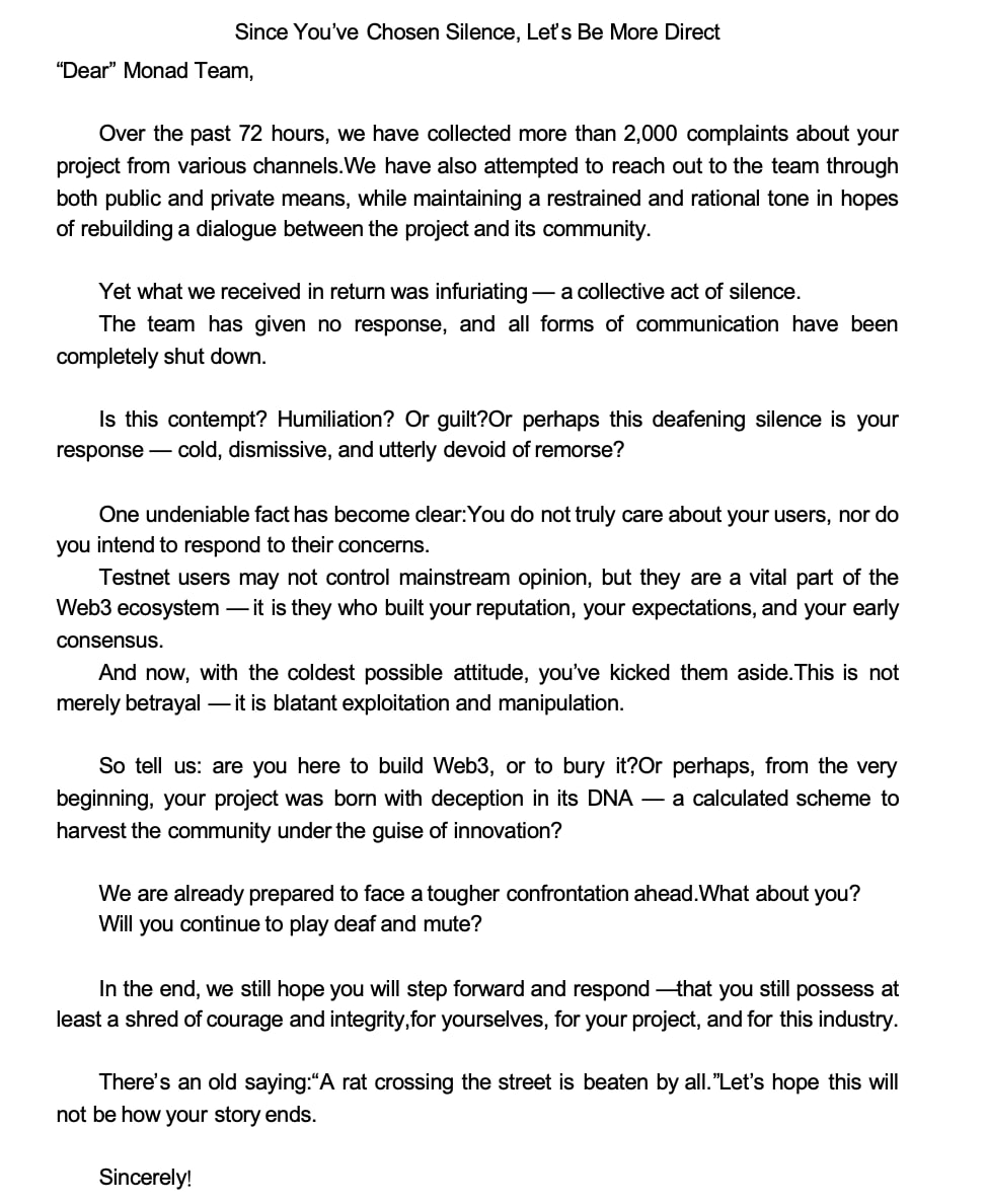 我们依然相信 Monad 项目的愿景,也依然愿意为项目的长期价值做出建设性努力。但这份信任和热情,不应被消耗殆尽。