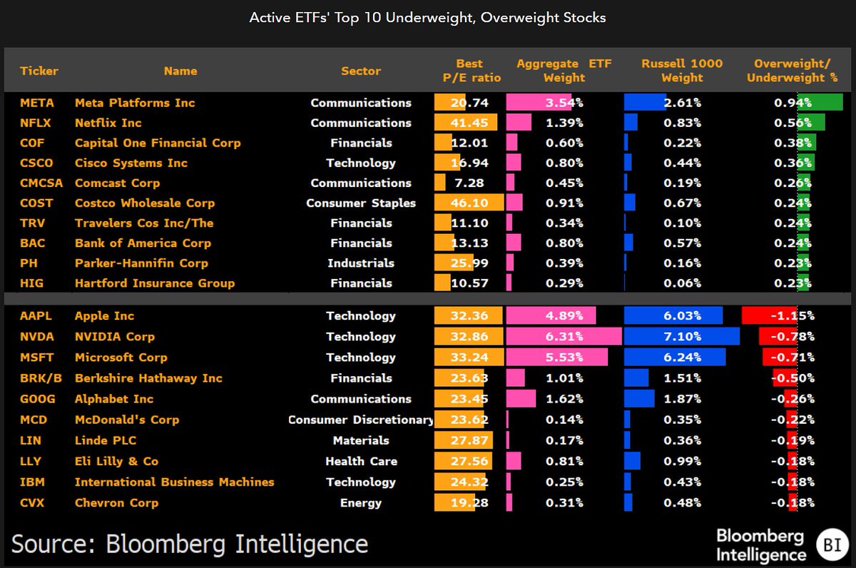 上周,@FrancisSharoon 和我研究了主动管理型大盘股 ETF 的整个领域。最大的增持和减持总计是多少? META 和 NFLX 名列增持名单之首,而谷歌则名列减持名单之首