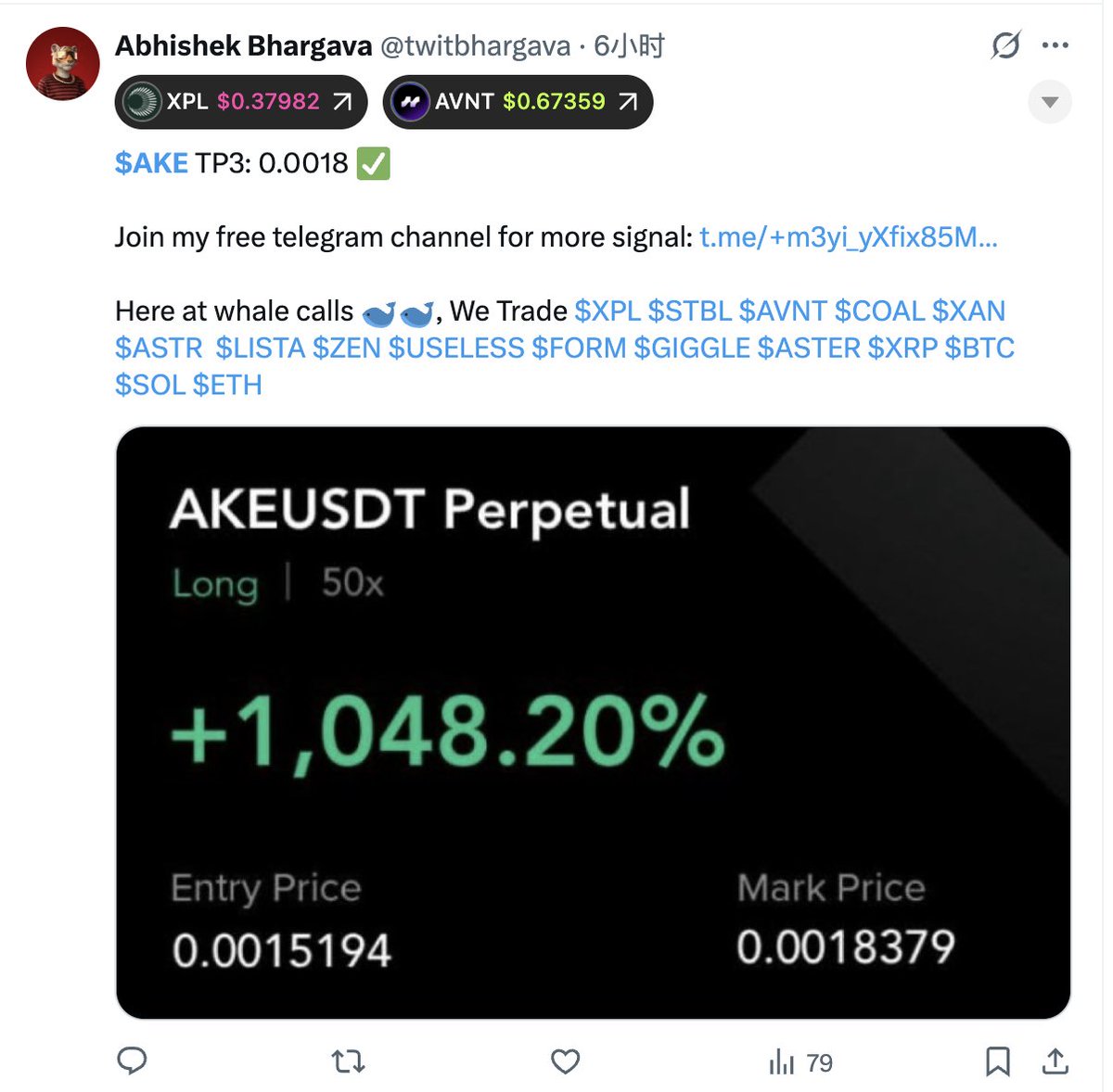 今天很多人在推特分享,自己做多 $AKE 获得1048%的收益。