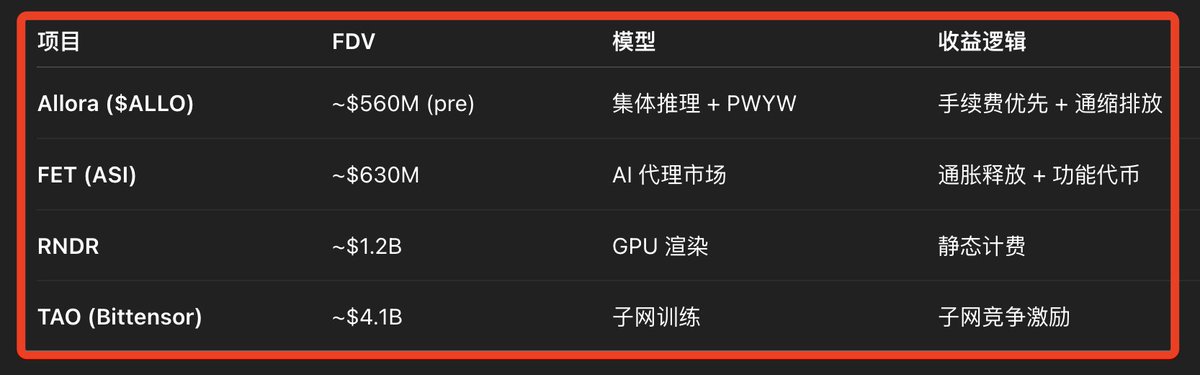 🔹Allora ($ALLO), 采用多模型协作 + PWYW模式 ,收入来源主要是手续费 + 通缩排放,当前 FDV~$560M (pre) ,关键差异:模型“被使用”,真实经济闭环