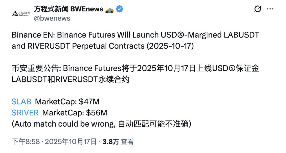 之前分享过的 RIVER 已经上线了 Binance 永续合约,这可以说是一个阶段性的起点。