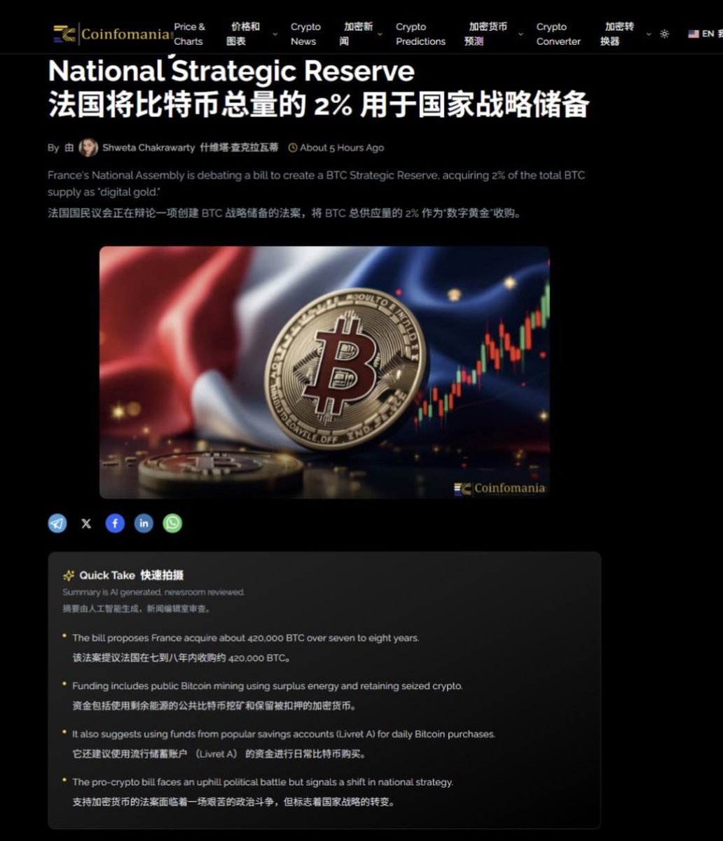 法国议员建议国家未来7至8年内购入42万枚BTC