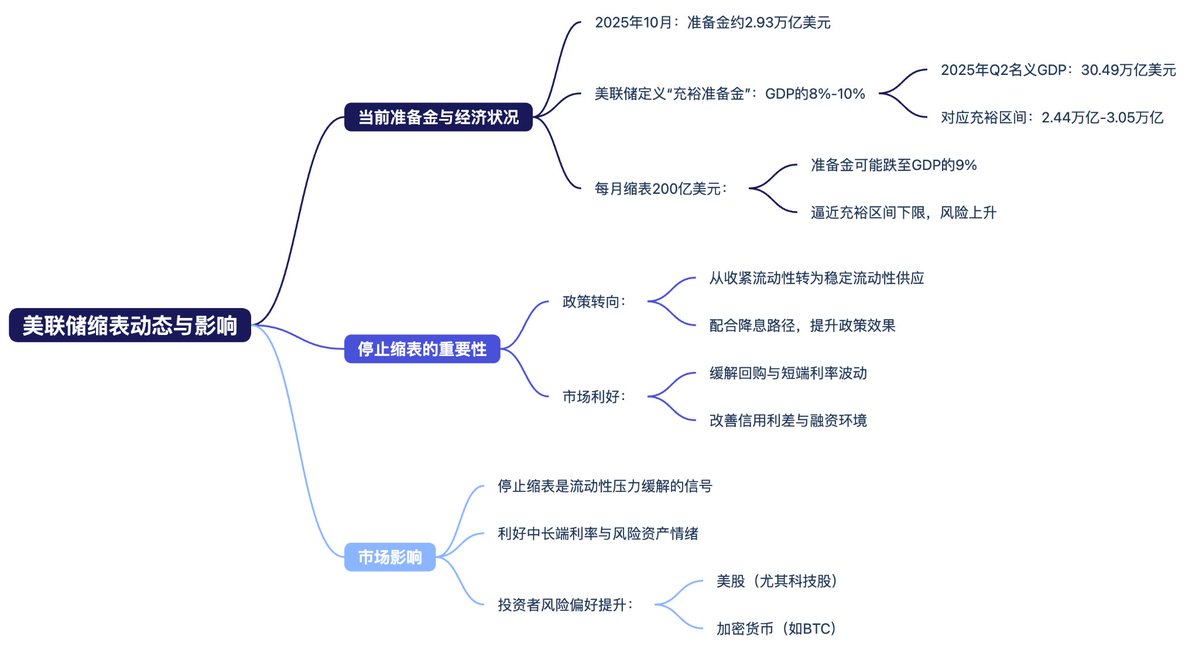 所以如果可以在十月停止缩表,则表示美联储的政策将从继续收紧流动性转为稳定的流动性供应,与降息路径相互配合,提升政策传导效率。银行体系准备金也不再继续下滑,回购与短端利率波动有可能会缓和,对信用利差与融资环境是温和且利好的。