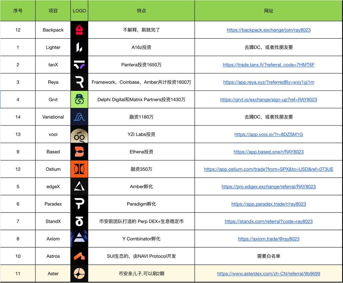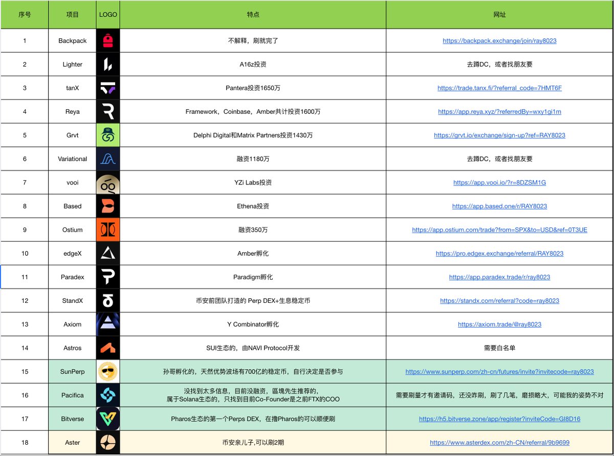 【Perp DEX合集更新版】根据昨天大家的反馈,又补充了三个,目前一共已经记录到了18个Perp DEX项目,看来这个赛道真的到白热化了。😂