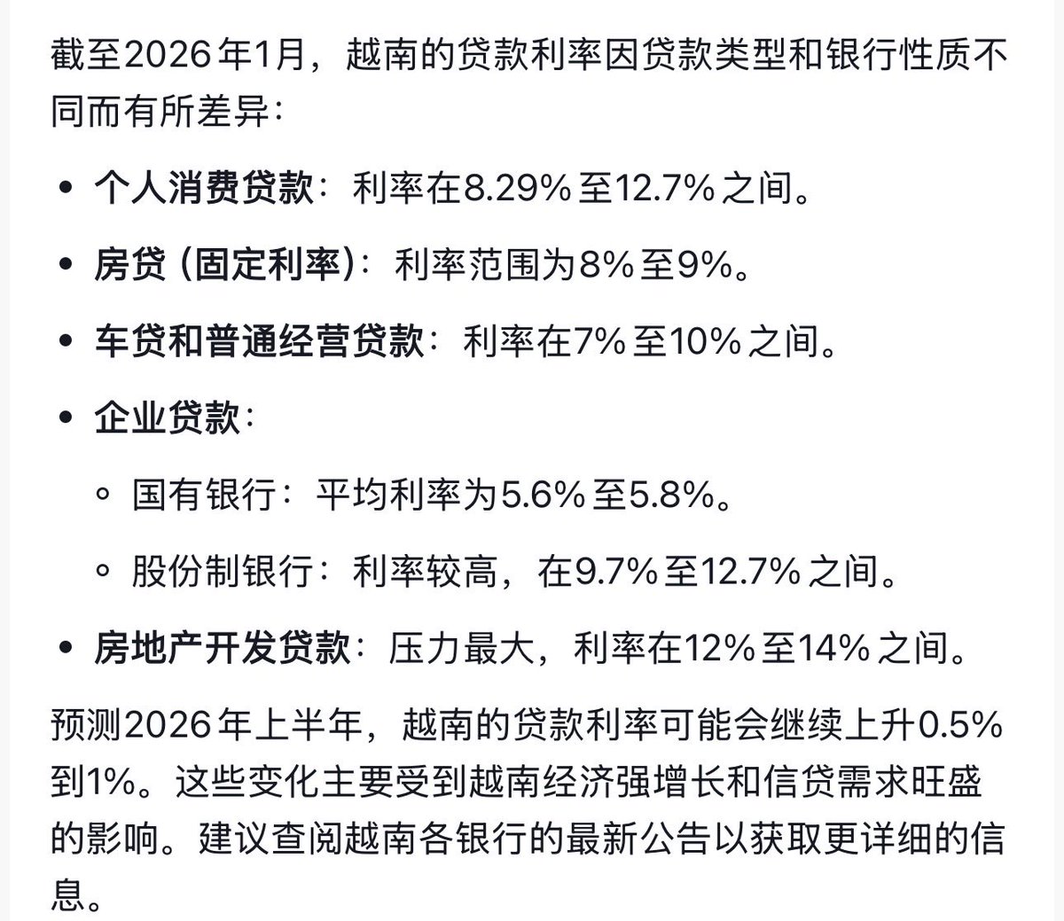 越南房贷利率目前高达8%,股份制银行贷款也要9.7%! 利率如此之高,说明越南全社会贷款需求强劲,与之对应的就是投资回报率高,因为投资赚钱所以都贷款 这与当下中国的情况截然相反,大家都存款不投资,因为干啥都亏钱,而且北京还一直要打台湾,根本不敢长期投资