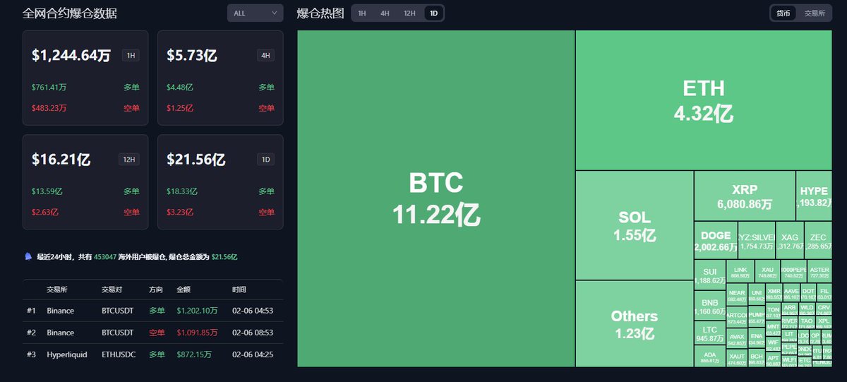 凌晨的下跌带走了95%以上的多头流动性,24小时爆仓$22.40亿其中多头爆仓$21.23亿 , $BTC 跌幅10% $ETH 跌幅17% ,更别说山寨币的跌幅了 下跌过程中连环清算