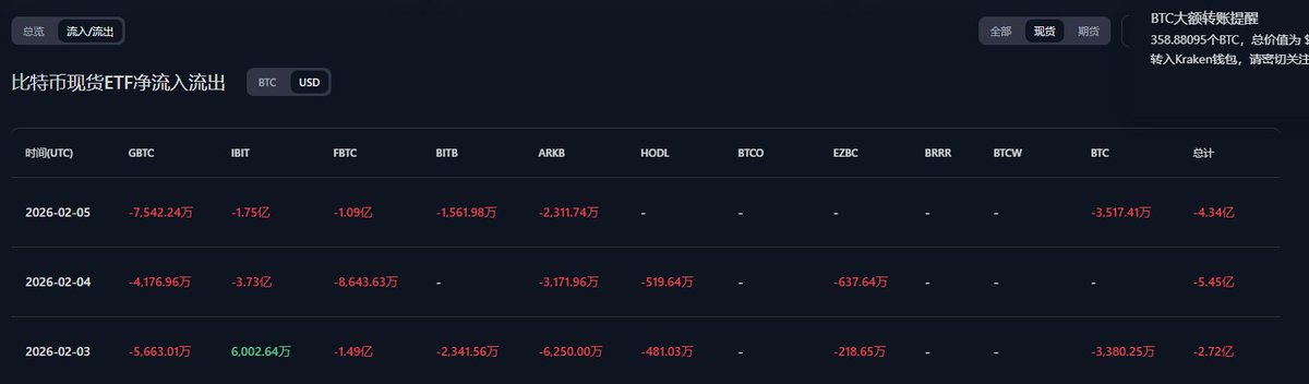 昨天ETF净流出4.34亿,最近三天流出12.51亿 当前位置还没确定是不是底部,此位置要是没有下跌 至少要盘整到2月15号之后,重要的一点是 美股还没怎么跌 ... 要是美股也蹦盘的话 加密市场会更加惨烈。