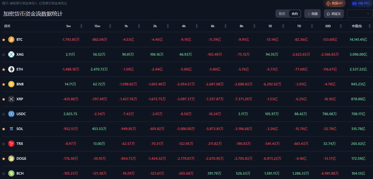 $BTC 现货资金最近7日流出10.17亿,合约资金流出49.33亿,是合约的4.8倍很明显当前市场完全是靠着合约来支撑,1011当日干碎清算了大批量的合约用户,之后几天连着抄底的也都全部清算,自此之后资金流向变的更加敏感