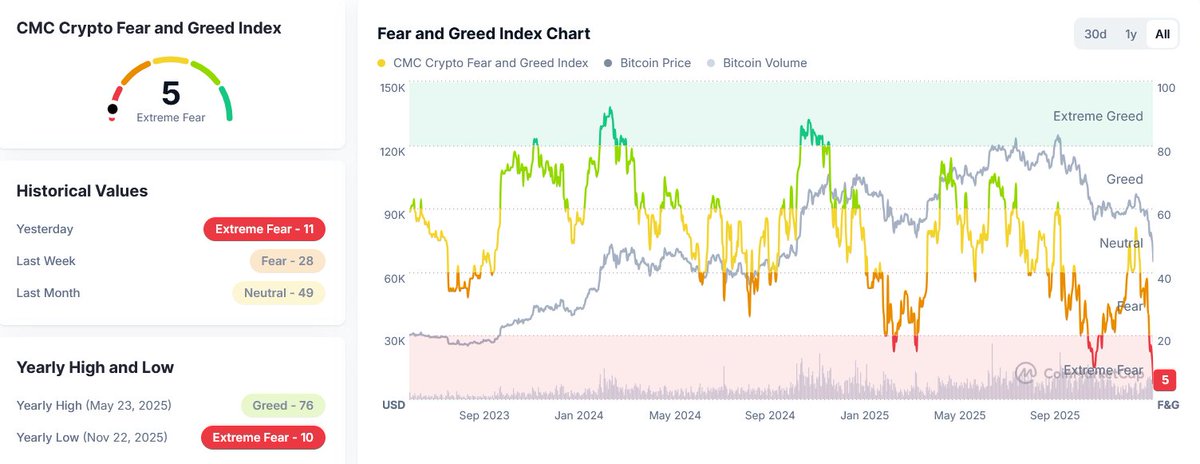 JUST IN: Fear & Greed Index hits record lows as crypto sentiment collapses. Sentiment is extreme. https://t.co/NVQSVKvSz8