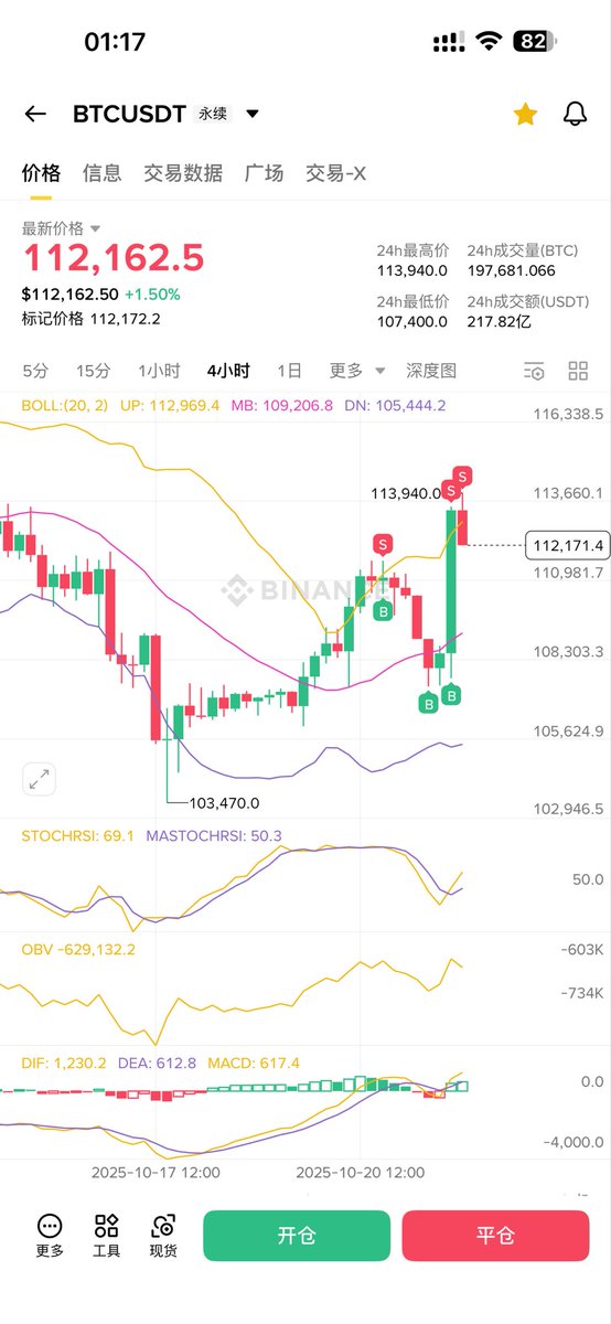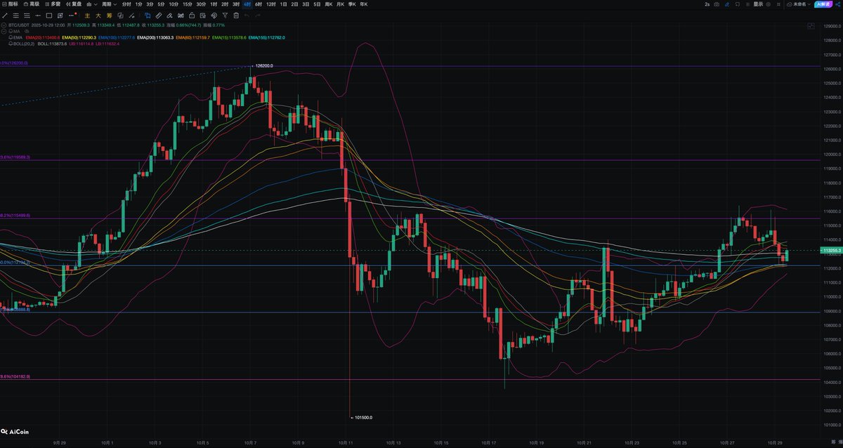这两天事情有点多,中间跳过了一小段少说了一次短线。现在补充下:大盘昨天从4小时级别的EMA20(113,400)获得支撑后反弹至116,000,但在该位置再次遇阻回落,回踩至日线EMA20(约112,200)附近止跌。目前价格正在尝试重新站上1小时EMA20(113,000),短线仍处于震荡整理阶段。