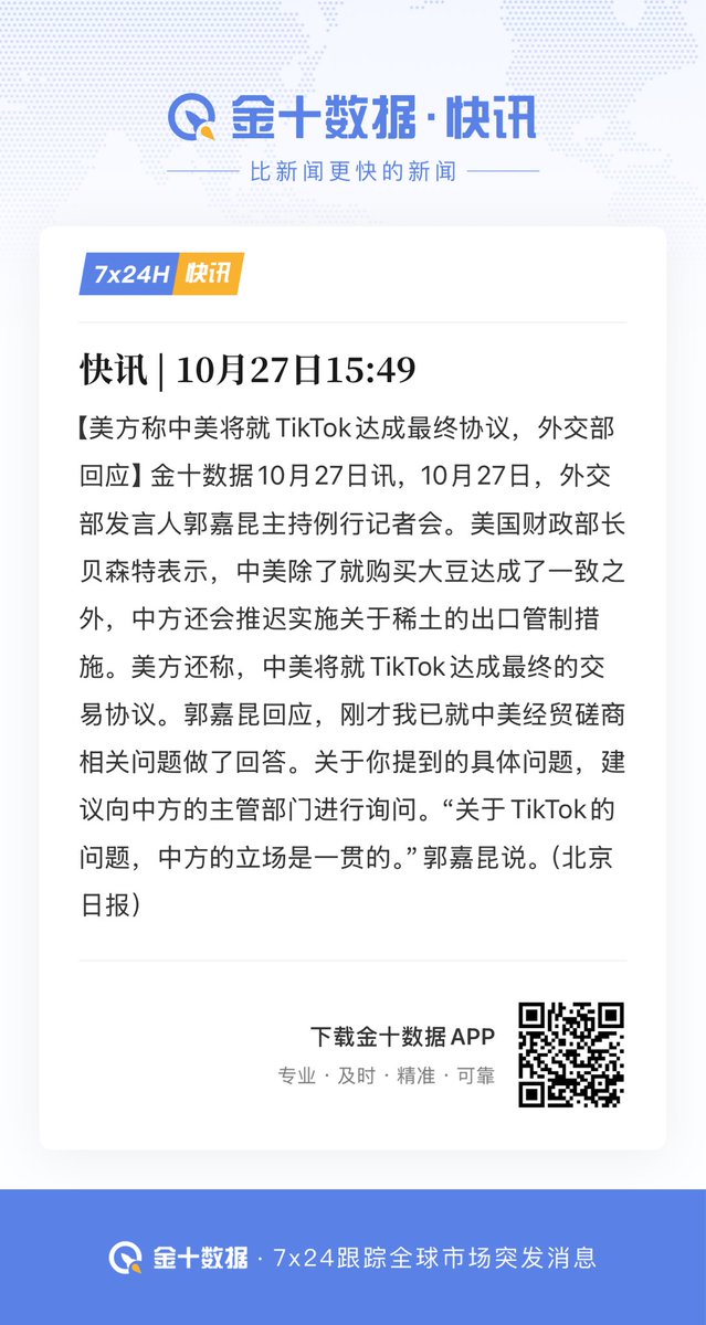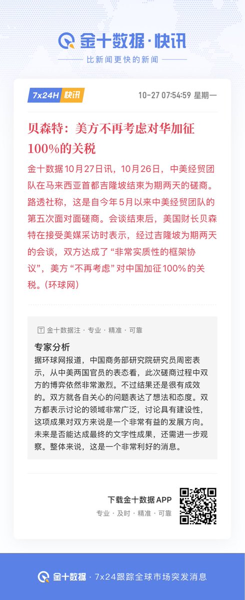 1、贝森特在接受美媒采访时表示,美方「不再考虑」对中国加征 100% 的关税,市场受此消息影响大涨