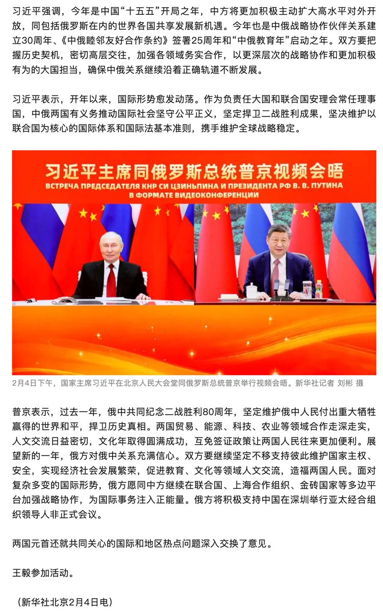 随后,习普视频会晤,就二战成果、国际秩序和重大热点问题进行协调;