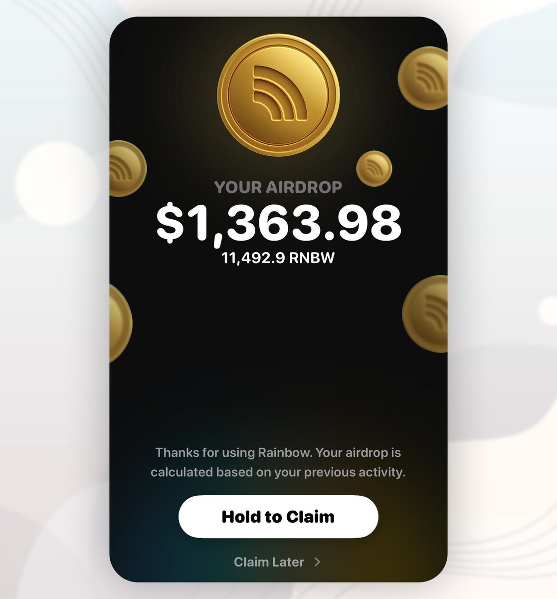 2、彩虹 @rainbowdotme 空投在 Rainbow Wallet 手机应用内可领取空投奖励