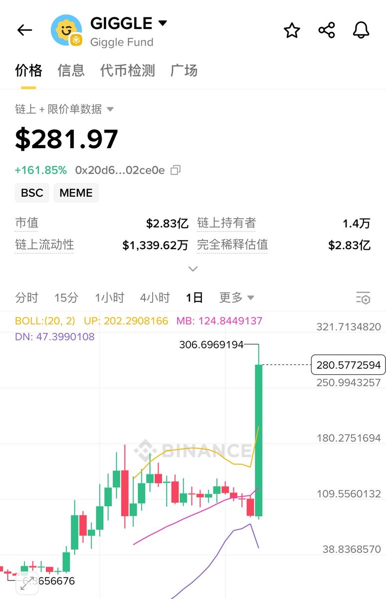 $giggle 上币安现货,20多call到现在280u,十倍。恭喜持有者🎉