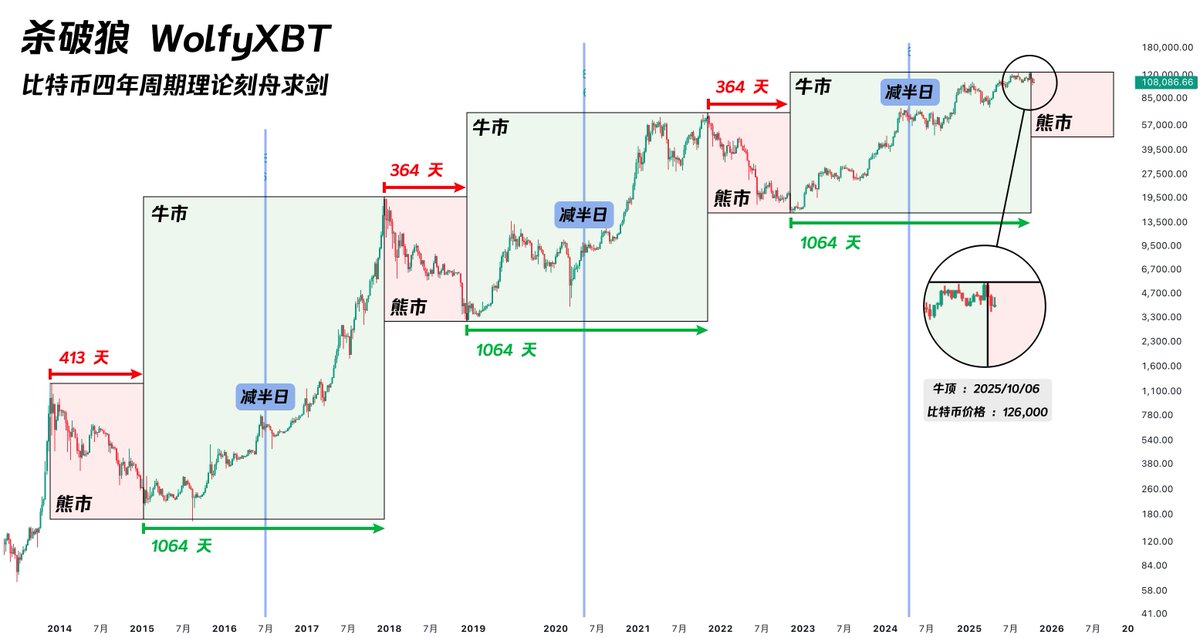 本轮牛市的牛顶落在 2025/10/06,比特币价格为 126,000。我也不希望唱空自己的事业,但是根据 “四年周期理论”,比特币价格确实已经见顶,我只想把这个事实转达给更多这个周期入圈的新人。