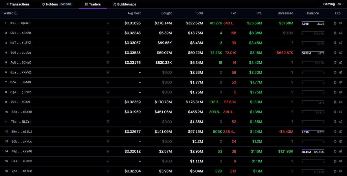 在 @GeckoTerminal 的“顶级交易者”选项卡上,几个钱包的已实现利润超过 100 万美元。