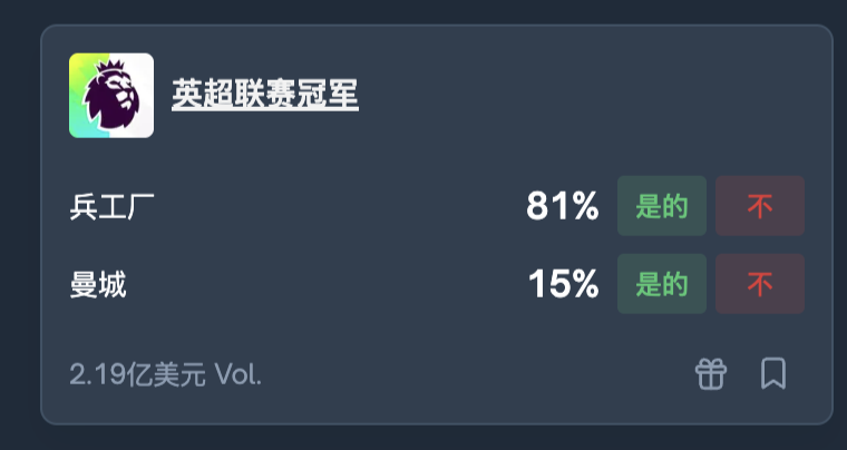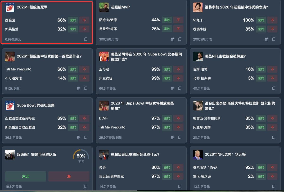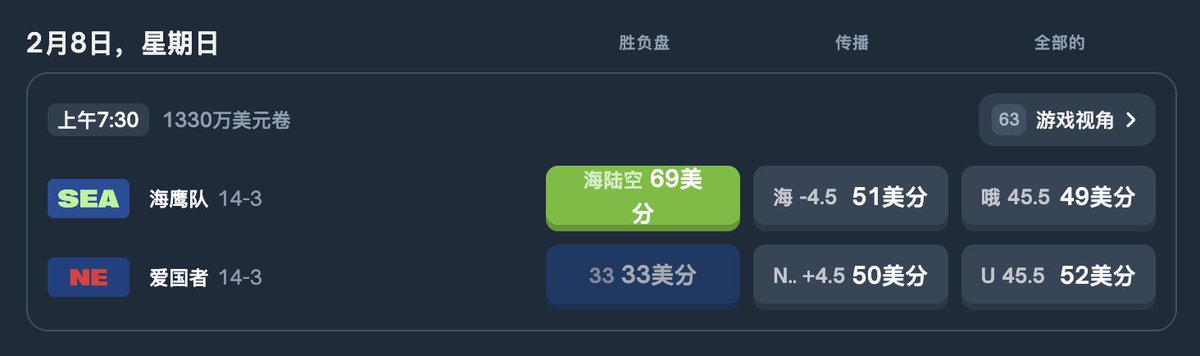 NFL 冠军预测今天把很多人惊讶到了,说这个 7 亿成交量,很恐怕的。 说实话,我对于这个数据非常无感,这是还未爆发的数据,全球最赚钱的体育联盟一年收益 200 亿美金意思。 我更关注的是明天超级碗决赛单场比赛 能不能突破 5000 万成交量, lol t1 那场决赛单场 3500 万。