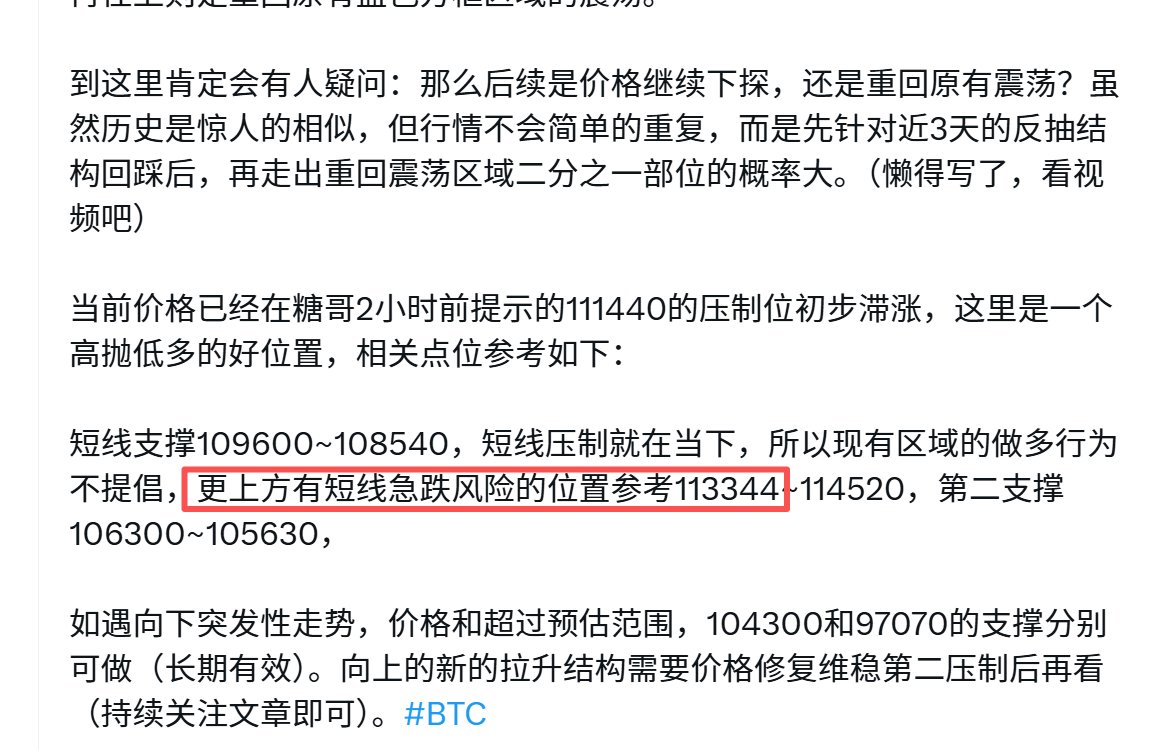当前价格已经在糖哥2小时前提示的111440的压制位初步滞涨,这里是一个高抛低多的好位置,相关点位参考如下: