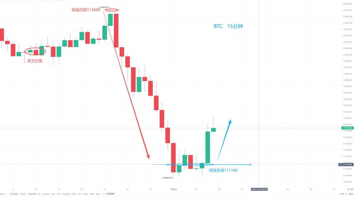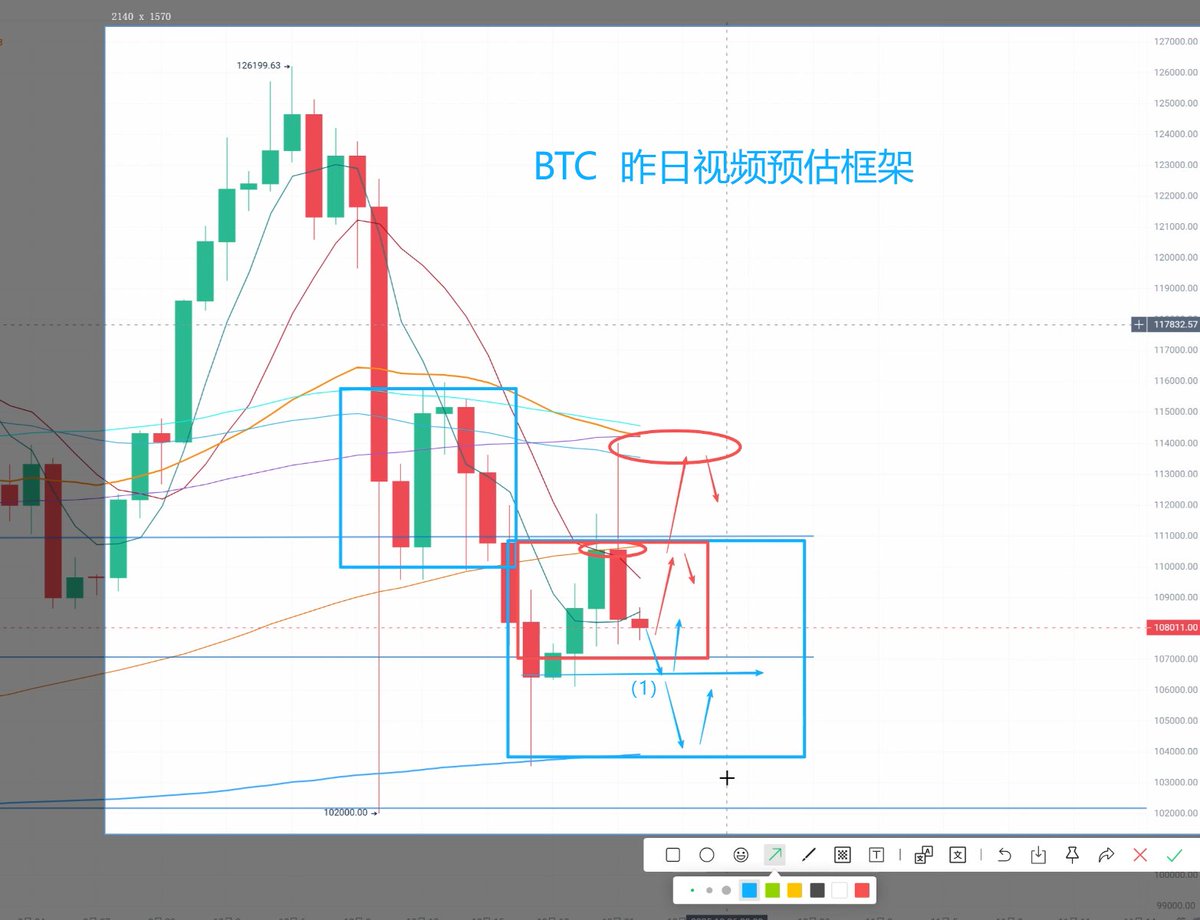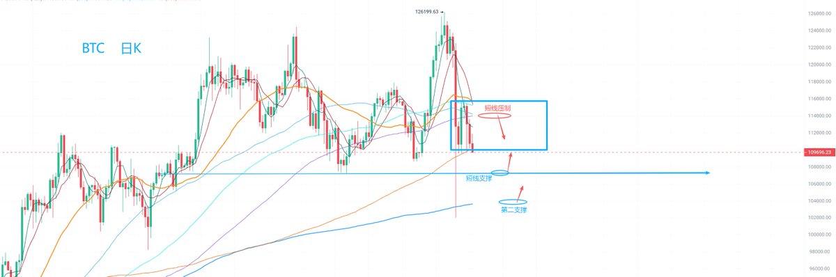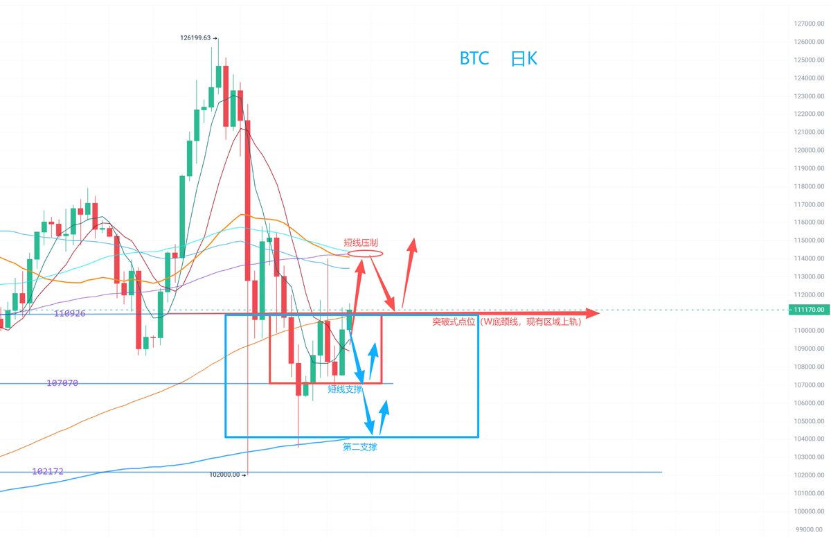 短线支撑111618~111168(缓跌可在111760考虑头仓看长做短,1:2快进快出),109480和10万分别是大周期看长做短和极端行情挂单的点位,前者有效期本周,后者3个月。