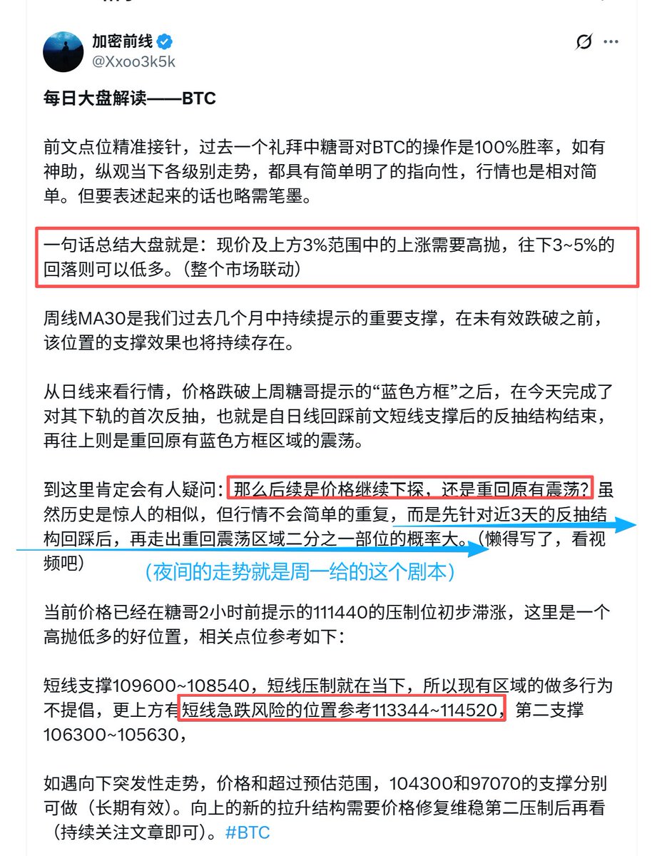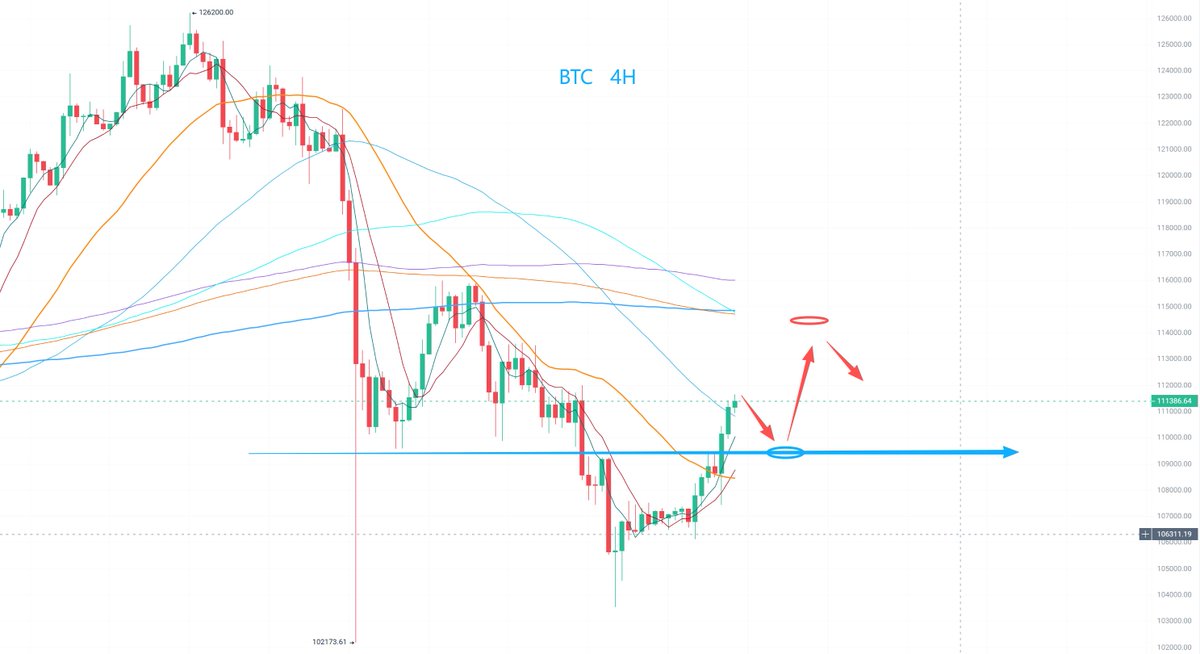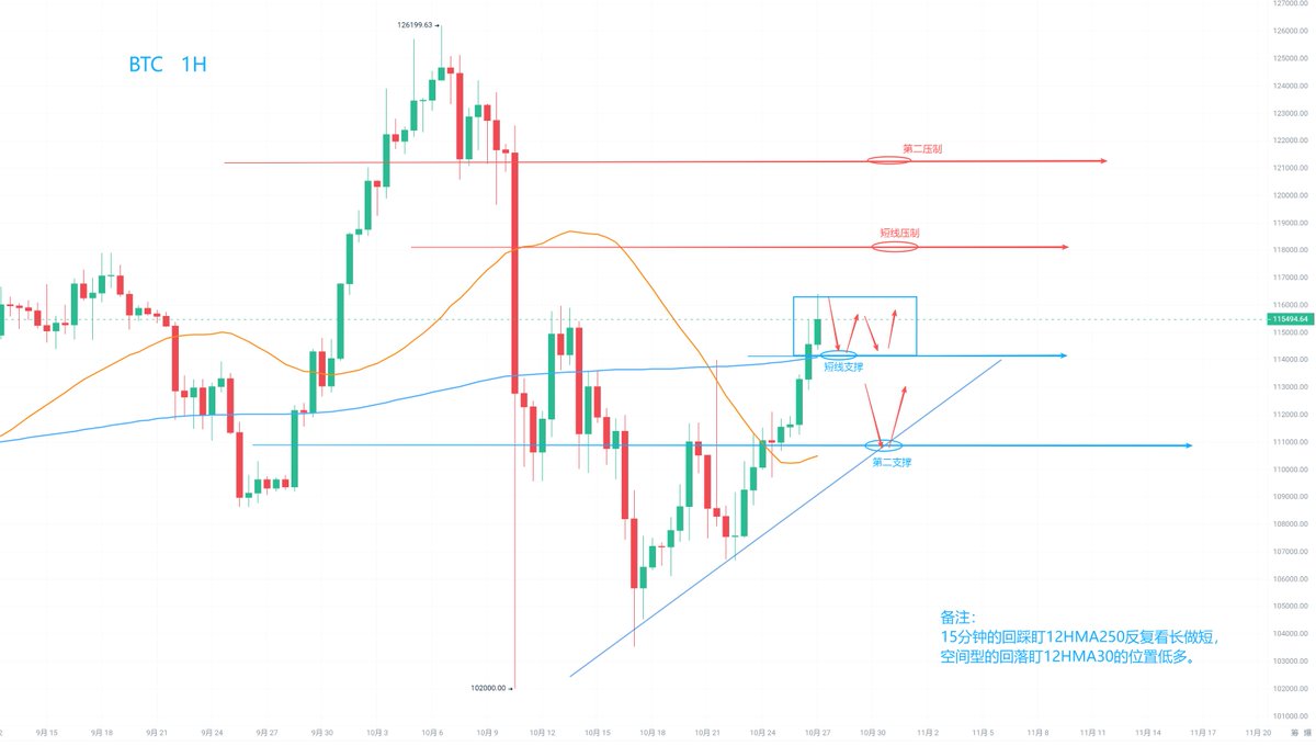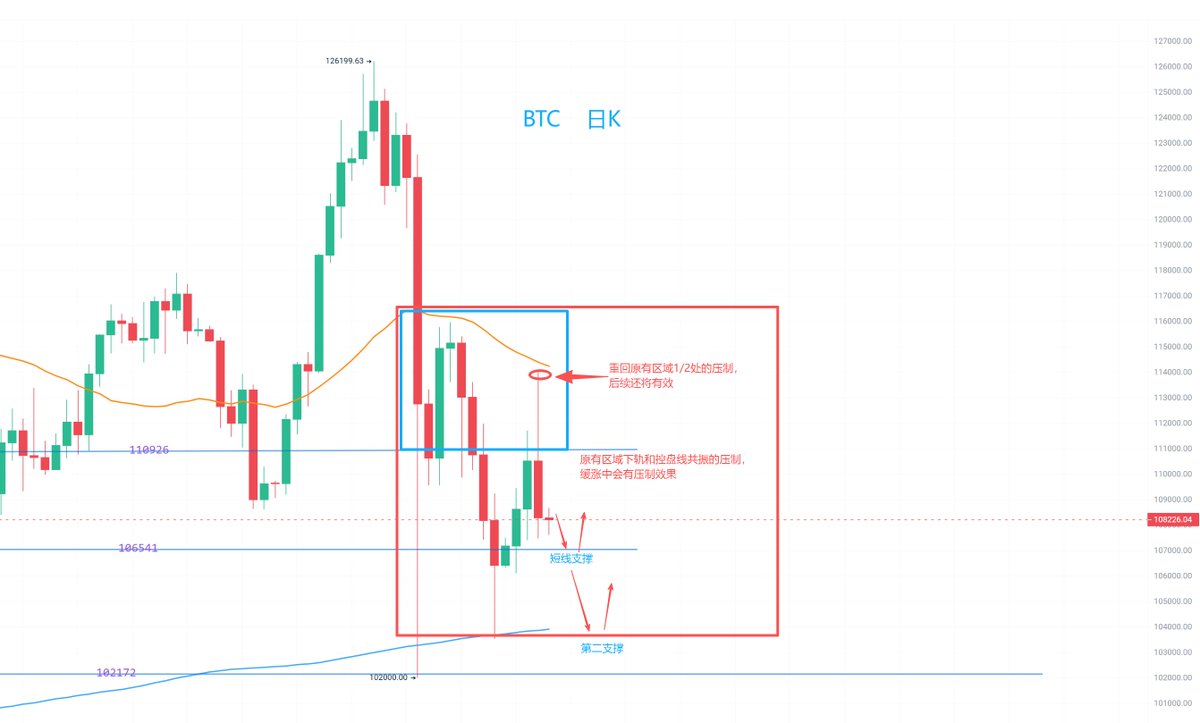 短线支撑111618~111168(缓跌可在111760考虑头仓看长做短,1:2快进快出),109480和10万分别是大周期看长做短和极端行情挂单的点位,前者有效期本周,后者3个月。